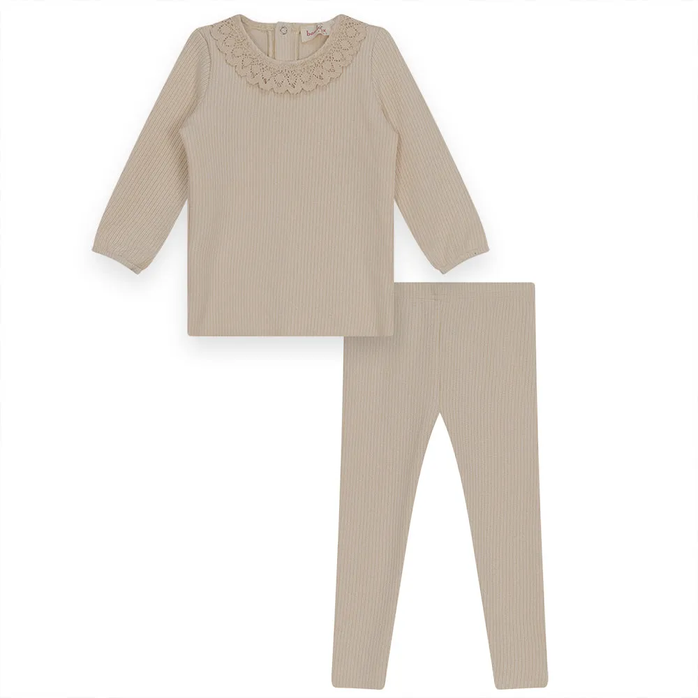 This Bondoux Bebe 2-piece set offers a timeless look of sophistication with a lace collar detail that will keep your baby looking stylish yet comfy. Crafted from a soft, breathable material, this outfit is perfect for any occasion.
