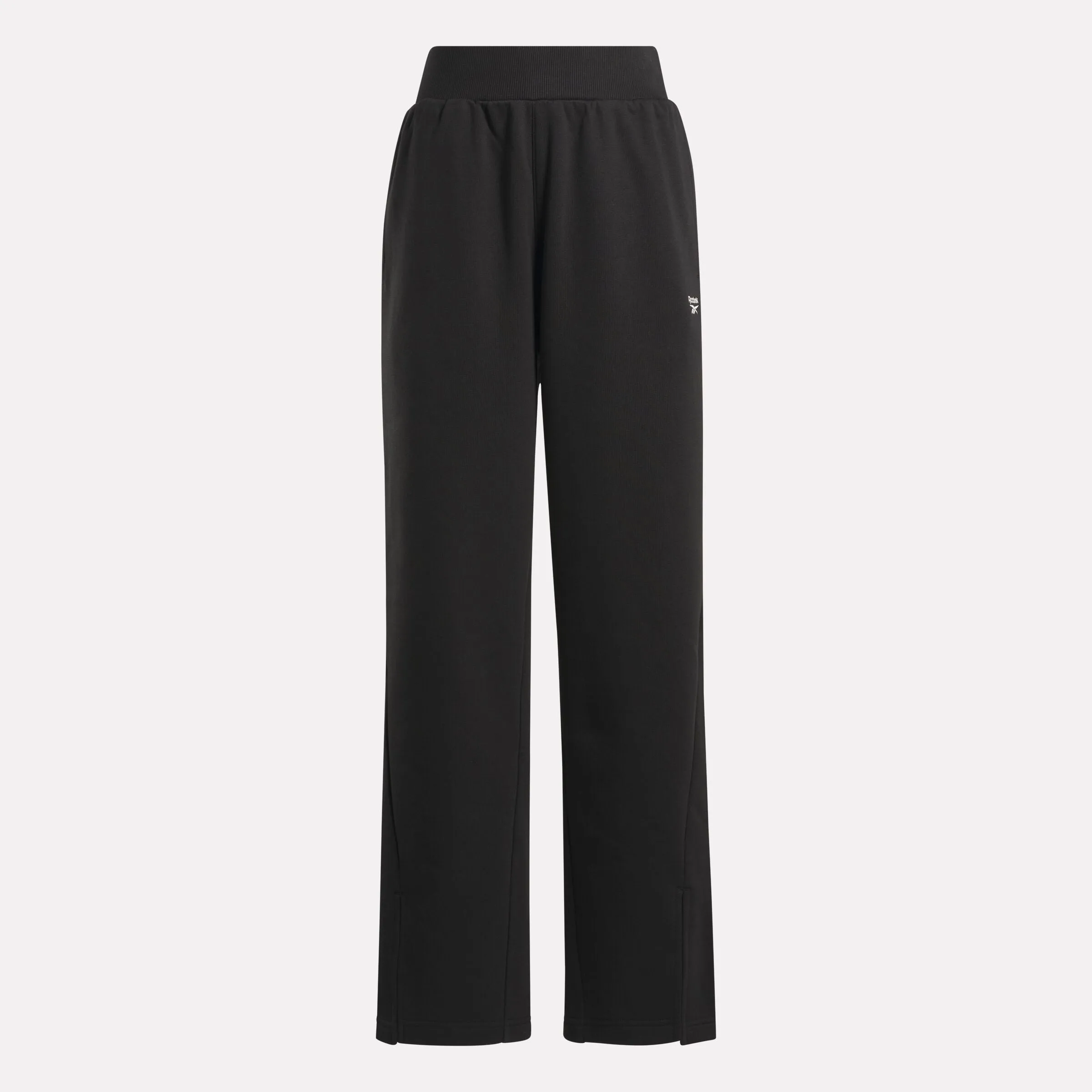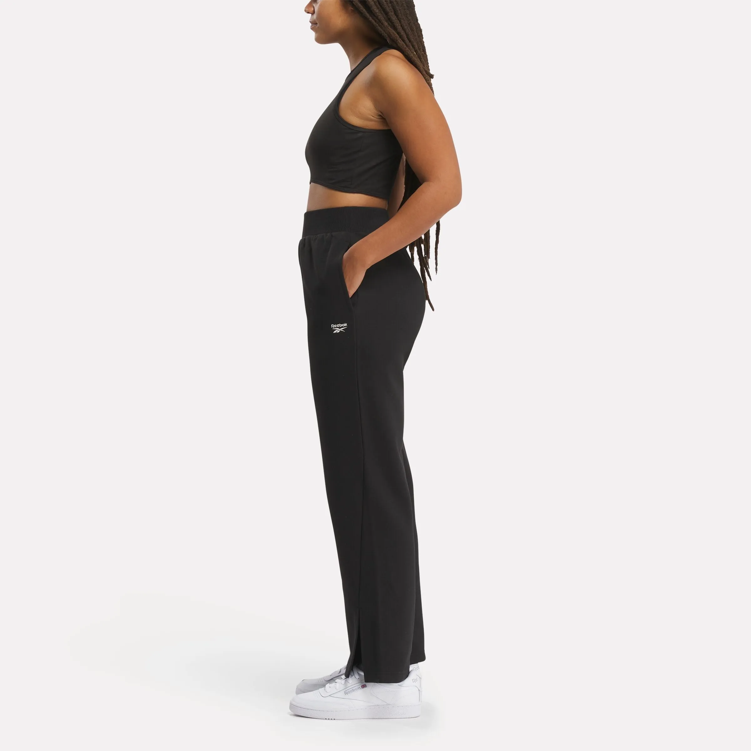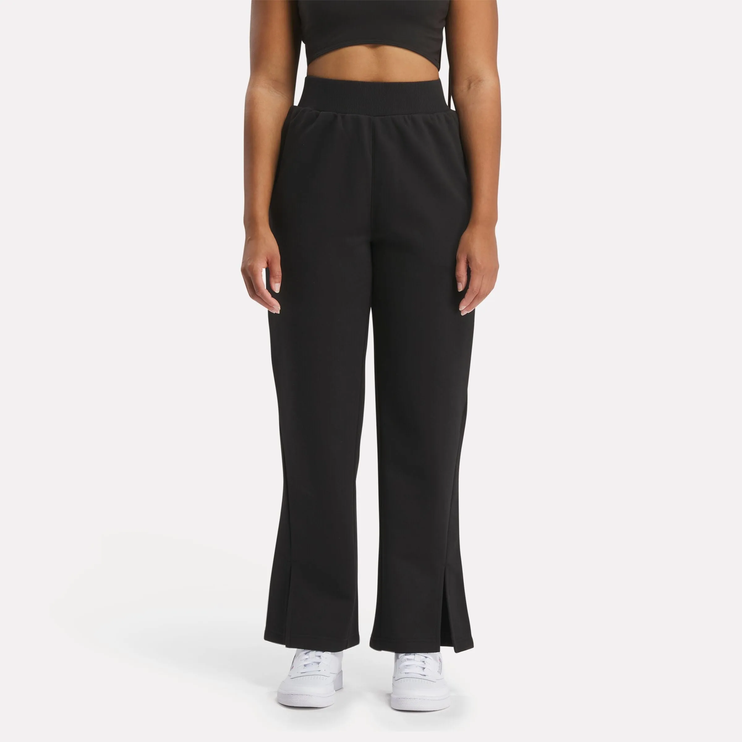 When modern style meets go-to comfort, you know you have to have it. These women's Reebok pants combine a flattering wide-leg silhouette with a fleecy soft fabric. Side slits on the leg create the perfect drape, and a high-rise elastic waist gives you confident coverage whether paired with a crop tee or a tucked-in tank top.
