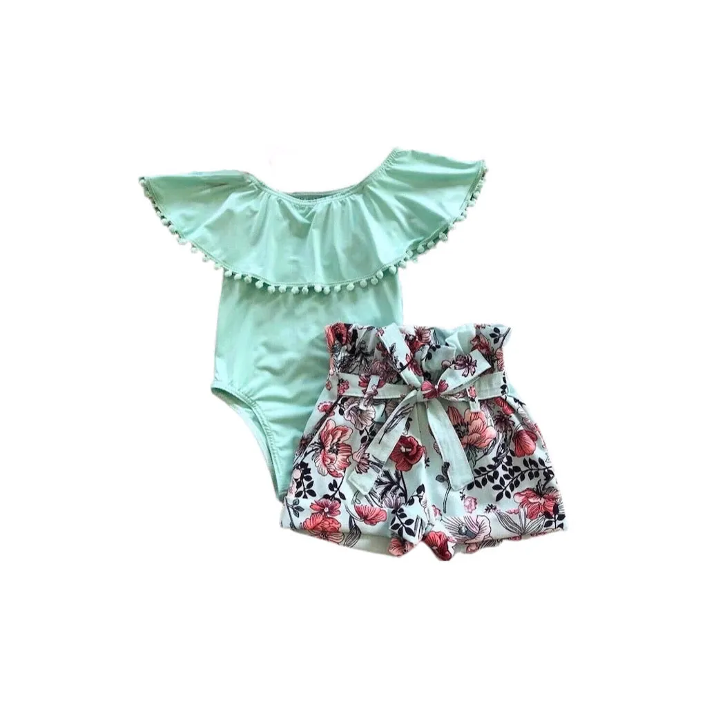 Beautiful Ruffle Leotard with floral shorts is one of my favorite Summer little girl outfits! This set is stylish and cute for your baby girl or toddler