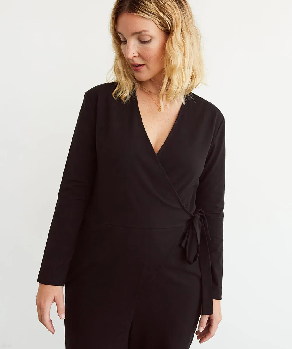 Belted wrap style with a relaxed fit that adjusts for pregnancy and postpartum.
